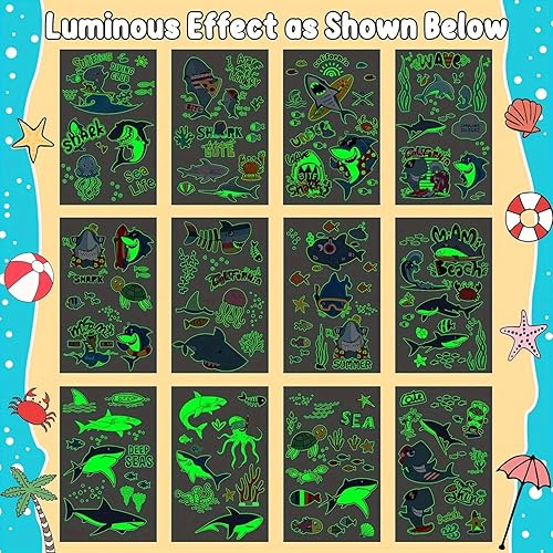 12 Sheets Glow Shark Temporary Tattoos, 145 Styles Luminous Shark Party Decorations Favors, Shark Ocean Tattoo Safe and Non-toxic Temporary Fake Stickers Gifts