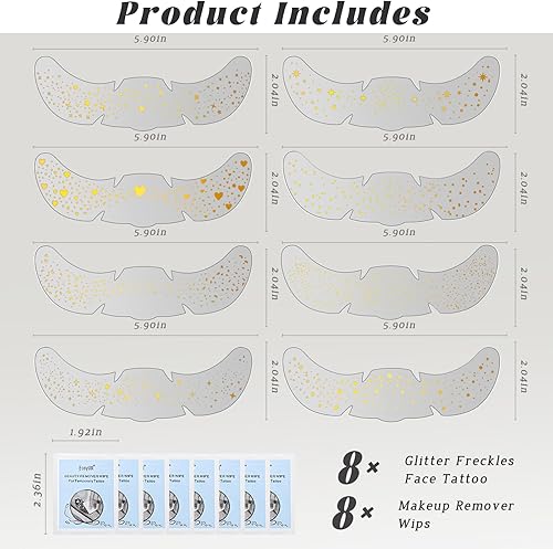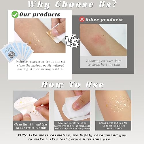 Long Lasting & Waterproof: Our freckle tattoos are made with waterproof ingredients that are waterproof and sweatproof to stay flawless all day long. Whether you're attending a party or any other event, our glitter patches will keep you glowing and radiant for a long time, giving you a gorgeous fairy look