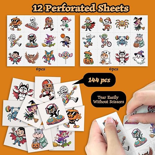24 Unique Halloween Designs: This set includes 144 tattoos across 12 perforated sheets—total 144pcs. With 24 playful, lighthearted Halloween designs like pumpkins, bats, and ghosts, kids can pick their favorite and enjoy.