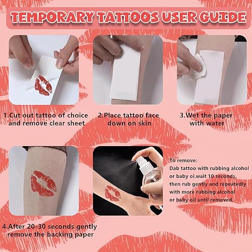 Safe & Skin-Friendly:Kiss lips temporary tattoos are made of high-quality tattoo ink and water to paper, non-toxic, harmless, chemical-free smell and lipstick temporary tattoo will not harm you skin. Do not apply red lip temporary tattoo to sensitive skin, near eyes, or if you are allergic to adhesives.