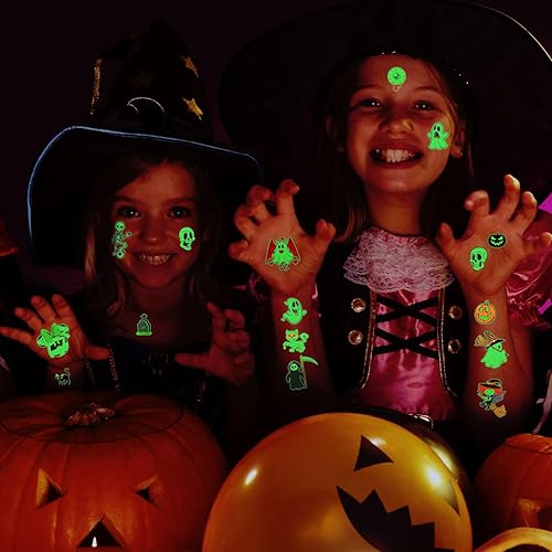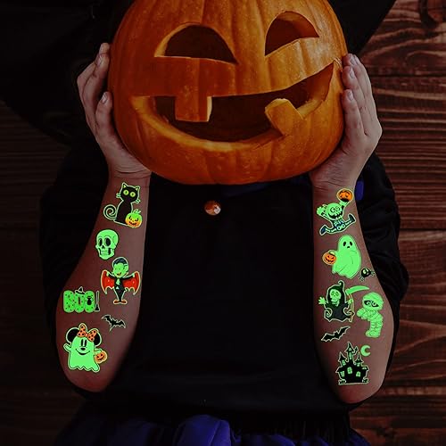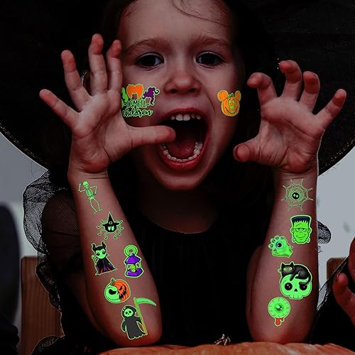 GLOW IN THE DARK: Features luminous tattoo designs that light up in darkness, including spooky Halloween characters like ghosts, pumpkins, skeletons, and witches. Each tattoo transforms magically in the dark with a luminous green glow that kids absolutely love.