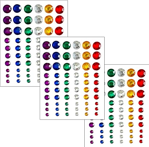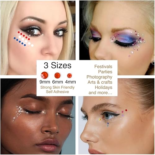 PACK INCLUDES: 3 sheets, total of 180 rhinestone stickers in 3 sizes: 4mm, 6mm & 9mm The most popular sizes for face, nails and body