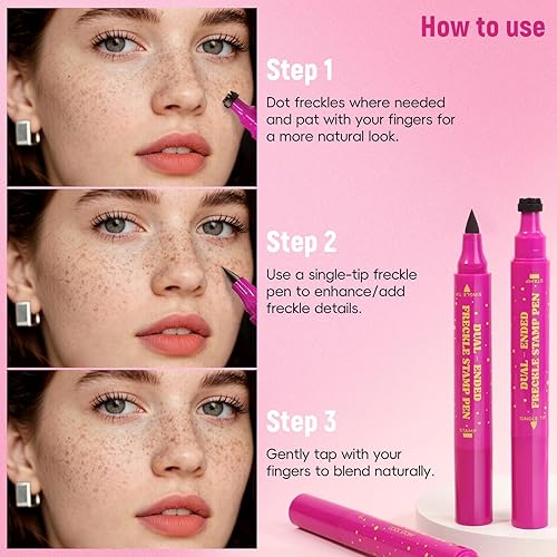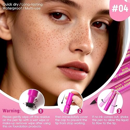Easy to Use: Use this dual-ended freckle pen to quickly draw freckles on your face with a freckle stamp, then fill in the blank areas with the single-tip freckle pen. When using the freckle pen before or after applying foundation, immediately use makeup remover wipes or makeup remover to gently wipe away any residue from each tip of the freckle pen to avoid clogging the freckle pen and making it unusable. Remove with a gentle makeup remover and it will go away