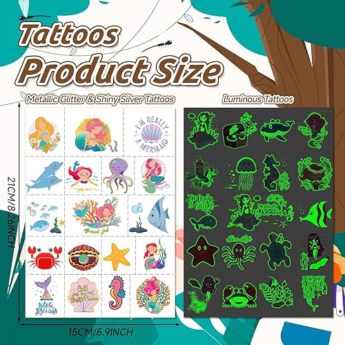2 Sheets Glow and Metallic Stickers, Birthday Party Favors Supplies Accessories,Party Supplies Favors, Pre-Cut Stickers (Mermaid)