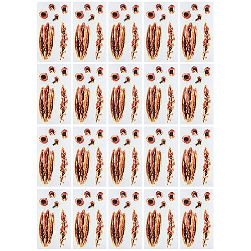 The temporary tattoos feature realistic fake blood and scar wound designs, which are highly trendy for the spooky season, adding an authentic and terrifying touch to your look