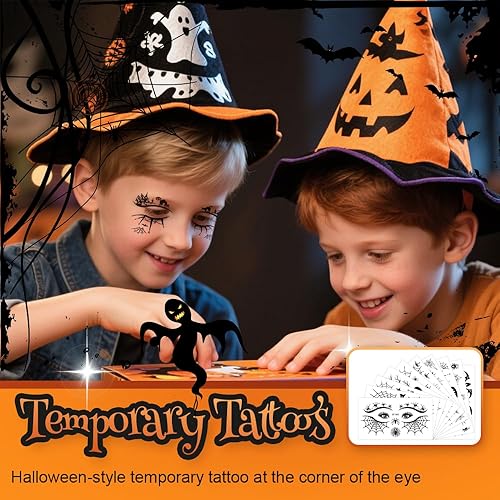 【Halloween Decoration Kit】These face and eye temporary tattoos come in a variety of Halloween-themed designs, including bats, skulls, spider webs, and pumpkin trees. Easily add a fun, spooky twist to your makeup or costume for a unique and eye-catching look.