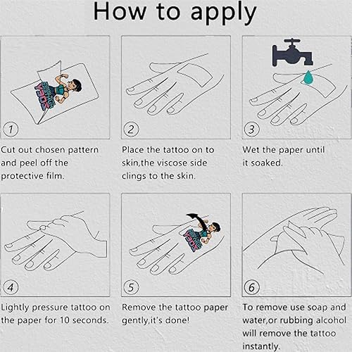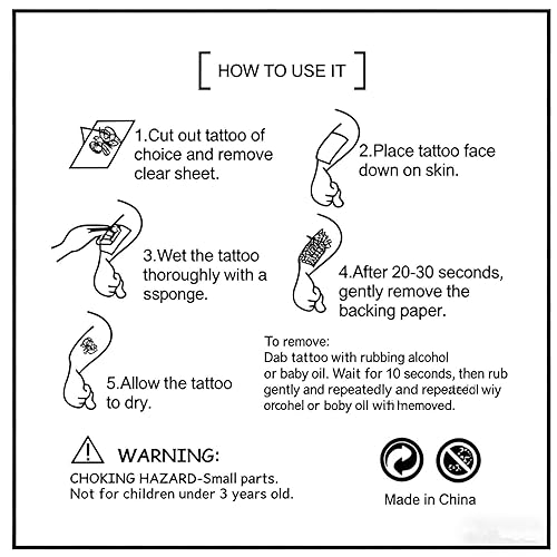 Easy to use: Place your favorite design pattern face down on clean + dry skin. Next, use a damp paper towel and lightly pat the tattoo paper. Leave it for 10-20 seconds then remove the tattoo paper and enjoy!