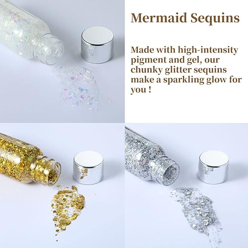 3 Bottles of Holographic Body Glitter Gel, Chunky Sequin Liquid Perfect for Nail, Lip, Cheek, and Eye Art