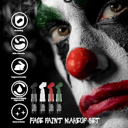 Face Painting Makeup Kit: Face painting set comes in a variety of color combinations including black, white, red, and green, it glides on smoothly and provides full coverage, perfect for creating spooky looks like clowns, zombies, vampires, witches, and so on, creating bold and unique holiday looks that will make you stand out at the party