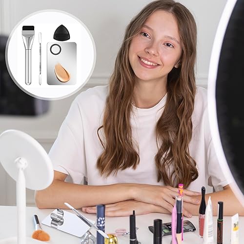 4 Pcs Makeup Foundation Mixing Palette Set Including Make Up Spatula, Makeup Brush, Palette Tray, Powder Puff, Foundation Makeup Mixing Palette, Makeup Palette Tray (Stainless Steel)