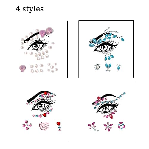 4 Sheets Face Jewels Tattoos Eye Jewelry Rhinestones Crystals Pearl Stickers Mermaid Face Gems Rave Eyes Body Bindi Makeup Temporary Stickers Decoration