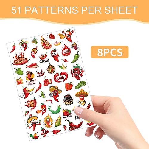 Chili Temporary Tattoo Set: You’ll receive 8 sheets of temporary tattoos, each measuring 9 x 6.3 inches (23 x 16 cm). Whether you’re hosting a cook-off, taco night, or hot sauce party, these tattoos bring the heat and the laughs