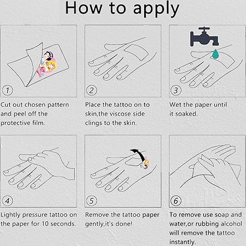 How to Use: Cut out tattoo of choice and remove clear sheet. Place tattoo face down on skin. Wet the tattoo thoroughly with a sponge. After 20-30 seconds, gently remove the backing paper