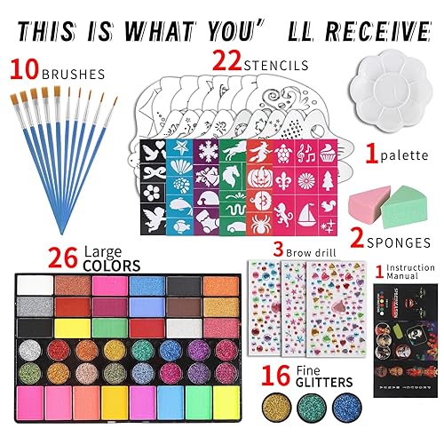 42 Colors Total – 18 matte shades, 16 glitter colors, and 8 fluorescent paints that glow under UV/blacklight, perfect for glow parties and nighttime events. Brushes: 10 detail brushes for large areas. Stencils & Stickers: 6 temporary tattoo stickers, 8 half-face templates and 8 snowflake templates, 2 sponges and 3 gem sticker sheets.