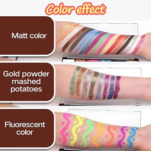 Exciting Variety for All: Features 18+ rich matte shades, 8+ vibrant fluorescent colors, and 16+ dazzling glitter-infused "gold dust" shades for sparkly accents. Safe face glitter for kids and versatile body paint for adults, ideal for festivals, cosplay, sports events, or adding magical shimmer to any look.