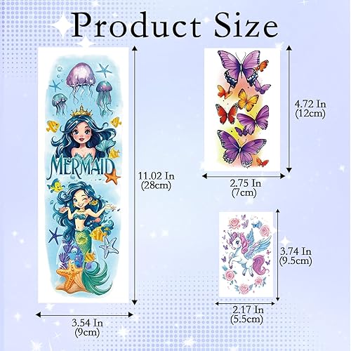 【Rich Temporary Tattoo Patterns】: A total of 52 realistic temporary tattoos for Kids, including 8 full arm sleeve tattoos (28x9cm), 14 half arm tattoos (12x7cm), and 30 small tattoos (9.5x5.6cm). Various popular design elements, including mermaids, unicorns, trucks, planets, owls, spiders, jellyfish, spacecraft, dolphins, sharks, dinosaurs, zombies, rockets, globes, pirates, octopuses, donuts, candy tattoos, and more.