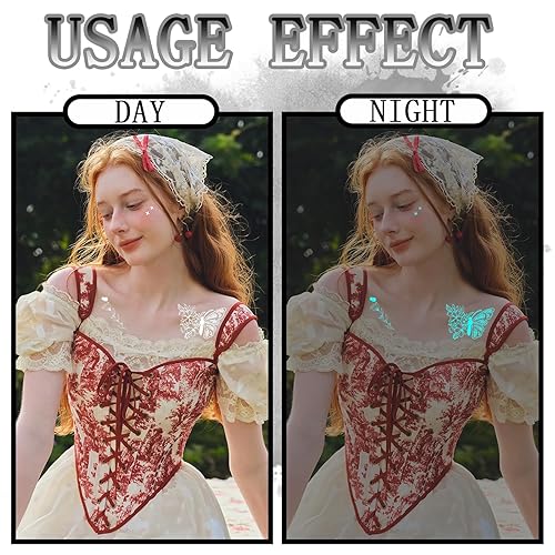 These temporary tattoos feature glowing blue butterfly and flower patterns that glow in the dark creating a charming effect and adding a mysterious charm to your appearance They are perfect for standing out from the crowd at night events