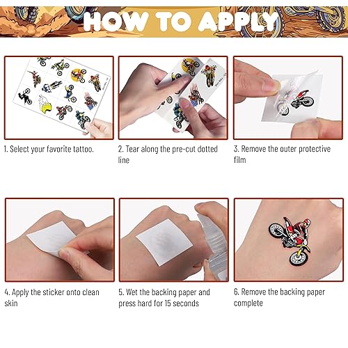 Perfect Cute Dirt Bike Racing Birthday Decorations: All the Pre-cut temporary tattoos are design with many themed. Fits any smooth part: face, hands, arms, shoulders, back, legs water bottle, cup,mug and other stuff and so on. Great fun for party favors, birthday gift, clubs, festivals or party supplies,etc. and can be used by children, kids, girls, boys, women, men.