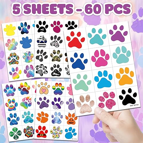 Funny Dog Cat Paw Print Birthday Party Supplies: 5 Sheets 60 PCS Paw Pre-Cut temporary tattoos stickers, Have a variety of cartoon themed characters, Children can easily Dog Cat Paw Print stickers and take unique photos to make fond memories. The size of each sheet is 6.3 * 4.7 inches.