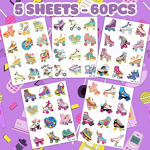 Pattern rich: Roller Skate Skating Pre-Cut Retro 80s 90s Disco Skateboard Temporary Tattoos include 5 Sheets 60 PCS, the size of each sheet is 6.3 * 4.7 inches. Easy to share,even if a lot of people's parties, you can have a different tattoo with others.These adorable tattoos will keep you and your little ones – and their friends – occupied for a while. Great for playdates, parties, or rainy days.