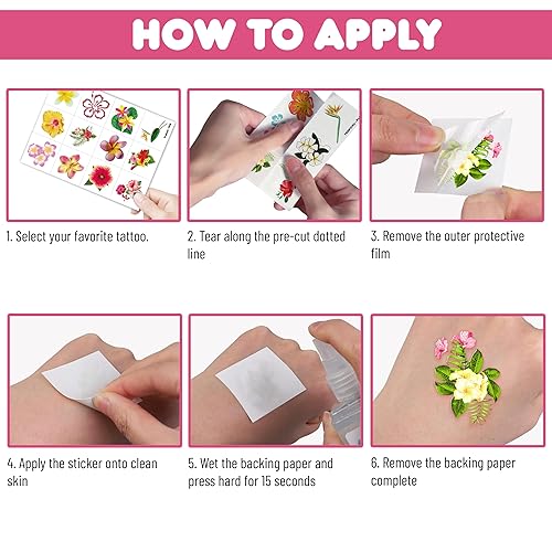 Easy to Use & Remove: Choose the pattern you like, and then face down on skin, wet the temp tattoo with water and wait for 10 seconds. Then gently tear off the white surface. You will get a tattoo. Removes with baby oil, or makeup remover. Please wipe gently to avoid skin abrasions.