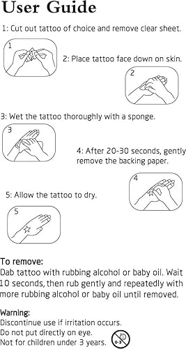 Easy To Use: Peel off clear film, place tattoo down to skin and covered with wet sponge. Keep for about 15 seconds, then remove as you see a fun look! Easily removed with Alcohol, Baby Oil, Coconut Oil, Olive Oil. Perfectly AVOID PAIN compared to real tattoos but similar effects.