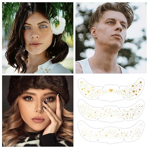 【Gold Freckles Stickers】: Easy to use,simply peel off the transparent adhesive backing, apply to the desired, gently press the star face sticker with a damp cloth or wet wipe, remove the backing paper after about 10 seconds, and the shimmering effect will appear. Instant sparkle! Easy to remove,use regular babies oil or makeup remover to effortlessly remove the renaissance fairy accessories stickers