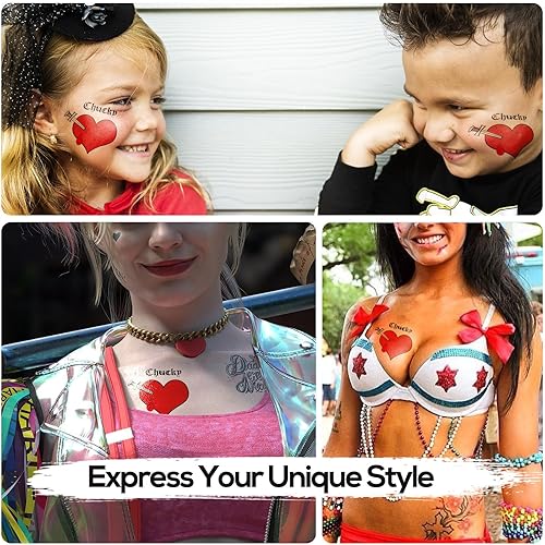 7 HORROR-READY DESIGNS ::-- This set includes scary red heart tattoos inspired by cult horror films, perfect for creating chilling Halloween or adding a spooky and iconic touch to your Halloween costume, cosplay, festivals, and parties. Each sheet measures 3.7 x 3.7 inches.