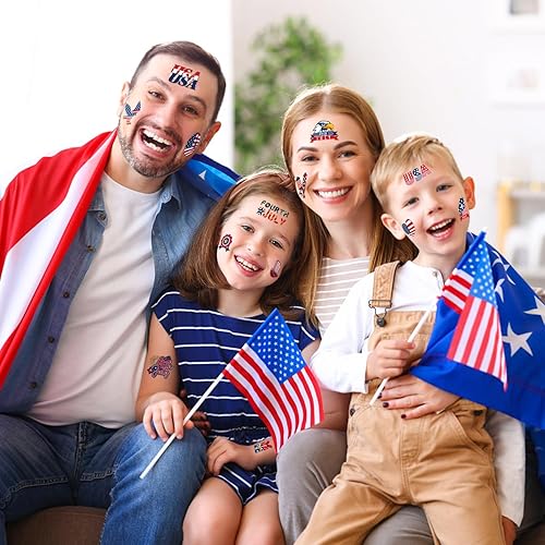 Safe and Long Lasting- The tattoo supplies are made of high quality paper,it is allergenic,non-toxic and safe for your skin. These patriotic tattoos are waterproof,you do not need to worry that it will easily fade or fall off. The July 4th decorations is also dry and sun-proof, can maintain bright colors for a long time and tear off without residue