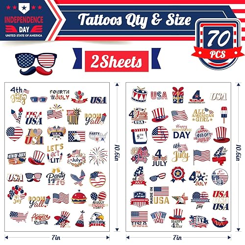 4th of July Accessories- You will get 2 sheets including a total of 70 designs USA tattoos,35 desgins per sheet. Size of each sheet fake tattoos is 10.6in x 7in.These temporary tattoo are designed for kids and adults to send your love to your country,you can stick them on your skin to increase patriotic atmosphere and cheer on USA on 4th of july