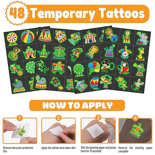 Durable & Kid-Friendly Design: Made from durable, child-safe materials, each LED light features a flexible rubber strap that fits comfortably on both small and large fingers. The waterproof tattoos are skin-friendly and designed to last through hours of carnival party. This product is intended for children aged 36 months and older.