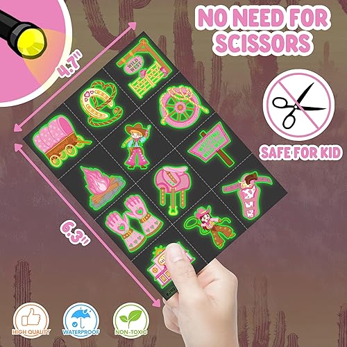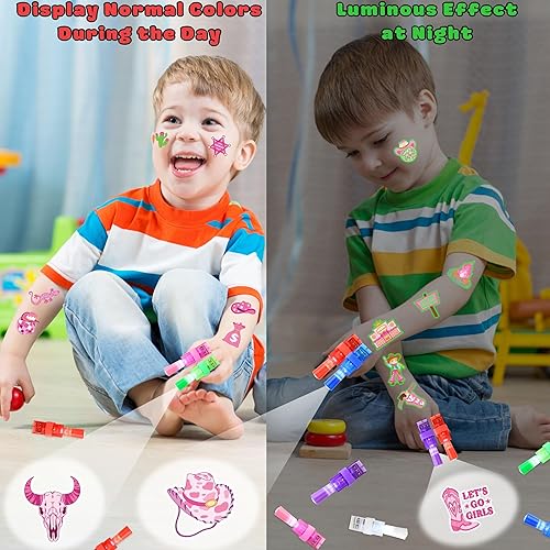 Durable & Kid-Friendly Design: Made from durable, child-safe materials, each LED light features a flexible rubber strap that fits comfortably on both small and large fingers. The waterproof tattoos are skin-friendly and designed to last through hours of Cowgirl party, suitable for ages 4 and up.