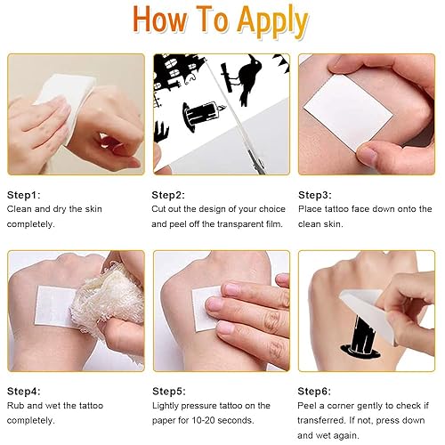 Easy to Apply and Remove: Choose the pattern you like and then peel off the clear plastic film, place the sheet on skin, dampen with wet cloth and wait a few seconds for it to dry, easily removed by rubbing with body oil or alcohol.