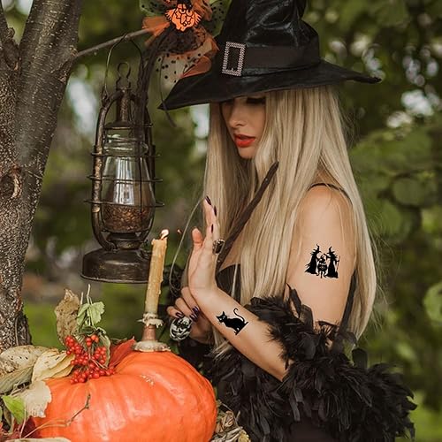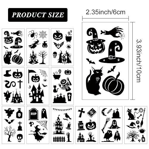 Halloween Temporary Tattoos for Kids: 12 sheets 77pcs Black Halloween temporary tattoo stickers contain Halloween elements, such as ghost, pumpkin, cat etc. Each sheet measures 3.93" x 2.35". It is very suitable for sharing with family, children and friends.