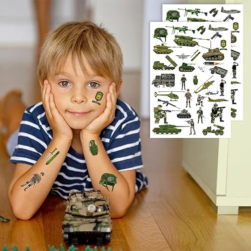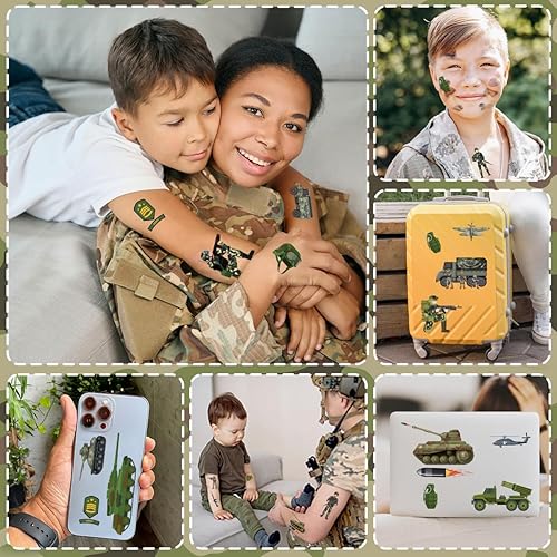 Unique Design: Each temporary tattoo sheet includes tanks, jets, camouflage gear, weapons, and saluting soldiers