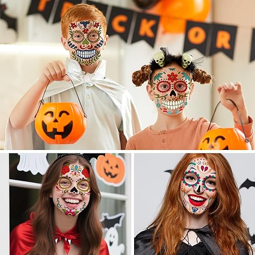 Package Include: You will receive 8 sheets different large Day of the Dead full face temporary tattoo kit in 8.26*5.9 inchs, perfect for celebrating the Mexican holiday or adding a touch of spookiness to your Halloween festivities