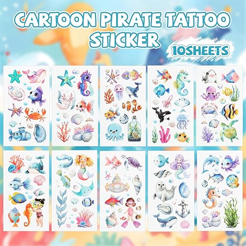 80-Piece Ocean Adventure Tattoo Kit:This DIY tattoo set includes 10 uncut sheets (2.7"x4.7") featuring 80 marine designs like sharks, whales and crabs - perfect for custom cutting to your preferred shape and size.