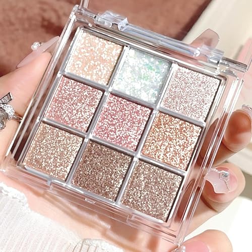 9 Colors Glitter Shimmer Eyeshadow Makeup Palette, Korean Sparkle Neutral Eye Shadow Palettes Highly Pigmented Long Lasting Waterproof Blendable sombras para ojos Pink White Golden Brown Eye Glitter(#Pearlescent 9-Color)