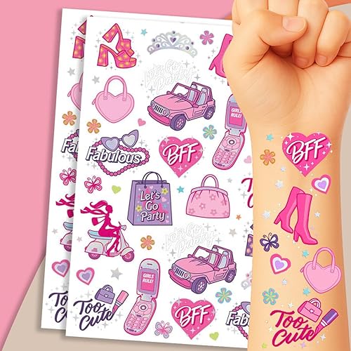 3. SIMPLE APPLICATION AND REMOVAL: Place tattoo on clean + dry skin, Lightly dab the tattoo with damp paper towel, Remove paper, allow tattoo to dry and enjoy! Instructions included on back of each sheet. b*arbie tattoos temporary for kids girly pink tatoos tattoo