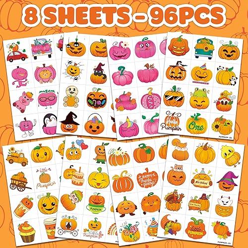 Package Includes: 8 Sheets Happy Fall Autumn Pumpkin Halloween Pre-Cut temporary tattoo, total 96 PCS different designs tattoos stickers. The sheets measures 6.3 inch X 4.7 inch, one size fit all adult and kids. Can meet most of your needs.