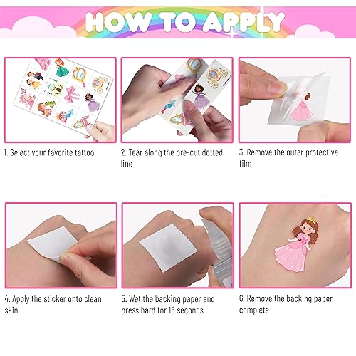 Simple Application: With just a few easy steps, your child can apply these tattoos effortlessly. Tear off the tattoo of choice and remove clear sheet. Place tattoo face down on skin. Wet the tattoo thoroughly. After 15-20 seconds, gently remove the backing paper. Allow the tattoo to dry. These delicate stickers are usually retained all days and can be cleaned with baby oil or hand sanitizer.