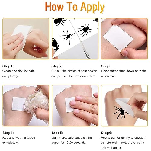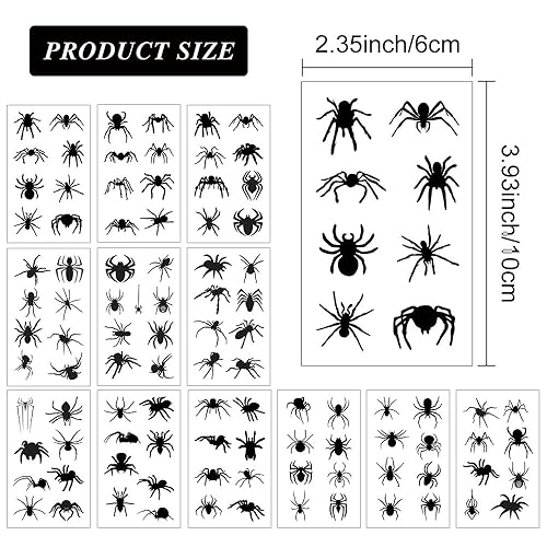 Halloween Spider Tattoos for Kids: Package include 12 sheets 97pcs Halloween spider temporary tattoo stickers. Each sheet measures 3.93" x 2.35". It is very suitable for sharing with family, children and friends.