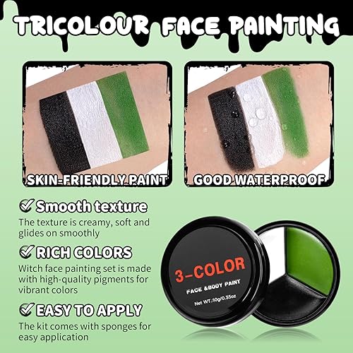 Highly Pigmented: The green face paint is smooth and creamy, which can fit perfectly with the skin, it has high color rendering and strong coverage, allowing your to keep a flawless witch look even during extended Halloween events