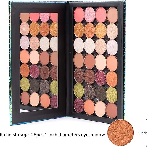 Green Mermaid Magnetic Makeup Palette:Length Outside: 8.07 Inches,Width Outside: 5.11 Inches, Depth Outside: .47 Inches ; Length Inside: 7.32 Inches ,Width Inside: 4.25 Inches, Depth Inside: .25 Inches,which can storage 28pcs 1 inch diameters eyeshadow.