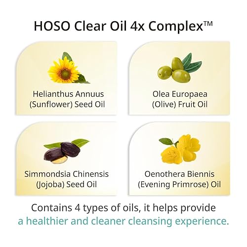 HOSO CLEAR OIL 4X COMPLEX: Contains Helianthus Annuus Seed Oil, Olea Europaea Fruit Oil, Simmondsia Chinensis Seed Oil, Oenothera Biennis Oil, it helps provide a healthier and cleaner cleansing experience.