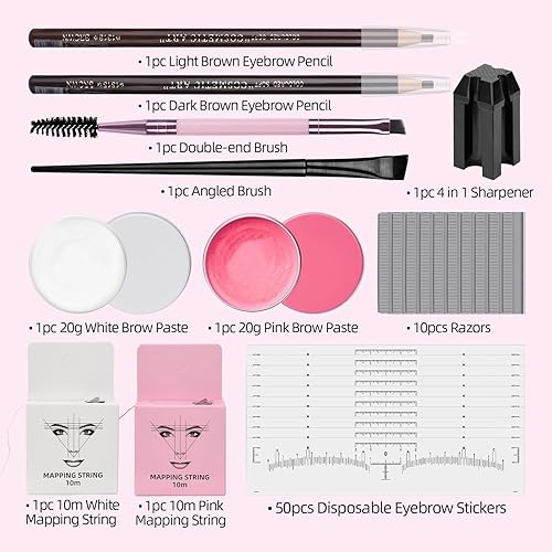 ★【What You Will Get】Package List includes 1pc 10m White Mapping String, 1pc 10m Pink Mapping String, 1pc 20g White Brow Paste, 1pc 20g Pink Brow Paste, 50pcs Disposable Eyebrow Ruler Stickers, 1pc Dark Coffee Eyebrow Pencil, 1pc Light Coffee Eyebrow Pencil, 1pc Double-ended Brush, 1pc Angled Brush, 1pc 4 in 1 sharpener and 10pcs Blades. Professional and comprehensive brow mapping and measuring tool set.