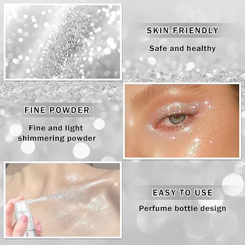 EXTRA-FINEST GLITTER POWDER: Shiny face glitter spray is composed of fine and shiny powder, featuring strong adsorption and easy application. Suitable for all skin tones. Perfectly enhance skin brightness and create a sparkle makeup look