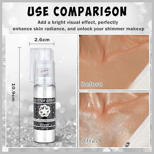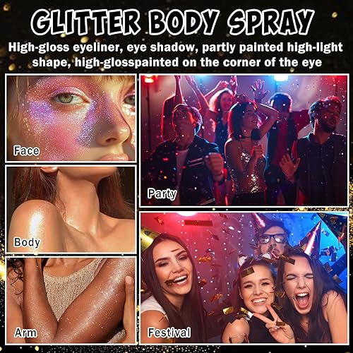 BODY GLITTER SPRAY: Body glitter uses extra finest glitter powder with a light and refreshing texture. A shiny and sparkling makeup effect, evenly sprayed on hair, hands, shoulders, face or clothes. Add a bright visual effect and unlock your shiny makeup