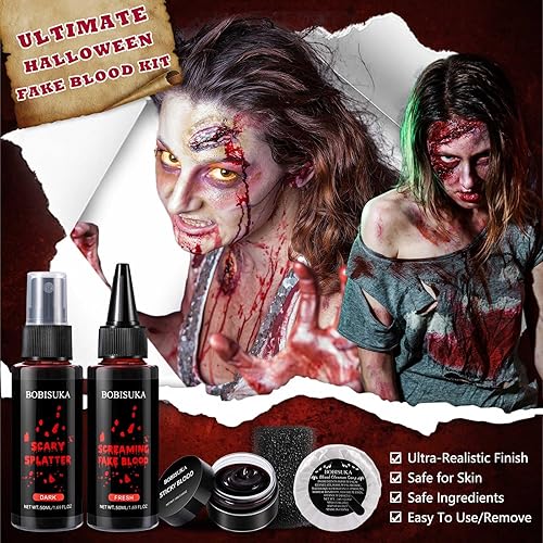 Halloween Complete SFX Blood Makeup Set: Everything you need for fake blood effects—Fresh Blood Dripping bottle, Dark Splatter spray, Sticky Coagulated Blood gel, Blood-cleansing soap, and a stipple sponge. Create drips, sprays, clots, and textured wounds in minutes. The all-in-one sfx makeup kit for parties, cosplay and film.