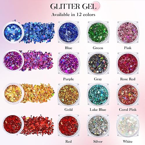Shimmering body glitter gel: This body glitter gel combines larger particles with ultra-fine glitter, creating a shimmering effect under light. It is available in 12 colors to suit different preferences and occasions. Each jar contains 4g/0.14 ounce.